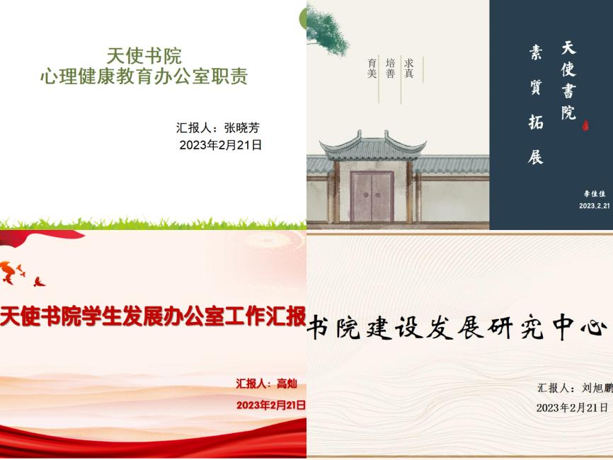 张晓芳、李佳佳、高灿灿和刘旭鹏四位老师分别就书院心理健康教育办公室、素质拓展办公室、学生发展办公室和书院建设发展研究中心的工作职责以及近期拟开展的各项工作进行了汇报。
