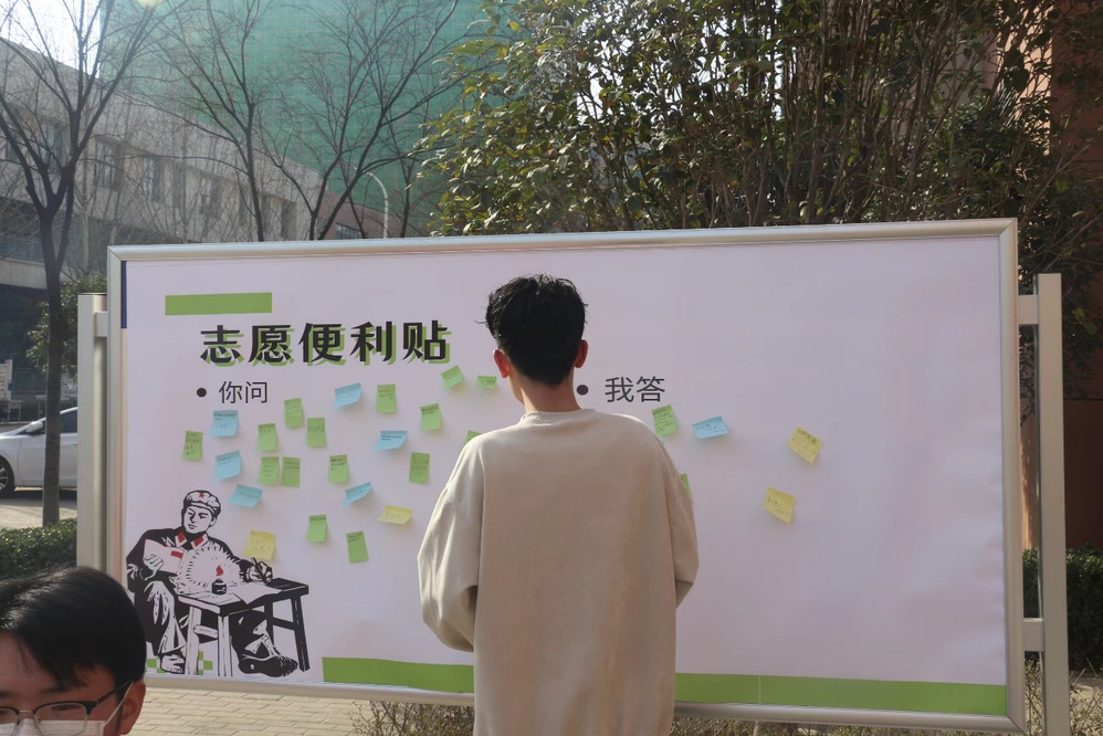 天使书院不断创新志愿服务理念,采取“志愿盲盒”、“志愿便利贴”等方式,帮助书院学子答疑解难。当天,40名身着红色马甲“天使雷锋”准时上岗,书院内外处处可见他们志愿服务的身影。