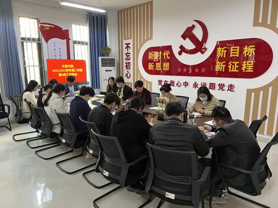 2023年3月7日上午,天使书院在书院二楼会议室召开本学期第三周学生工作例会,党总支书记、院长王芳,党总支副书记、副院长王翡翡,副院长王小珂,书院办公室主任马鹏飞,组织员李文煜及全体专职辅导员参加会议。会议由副院长王小珂主持。