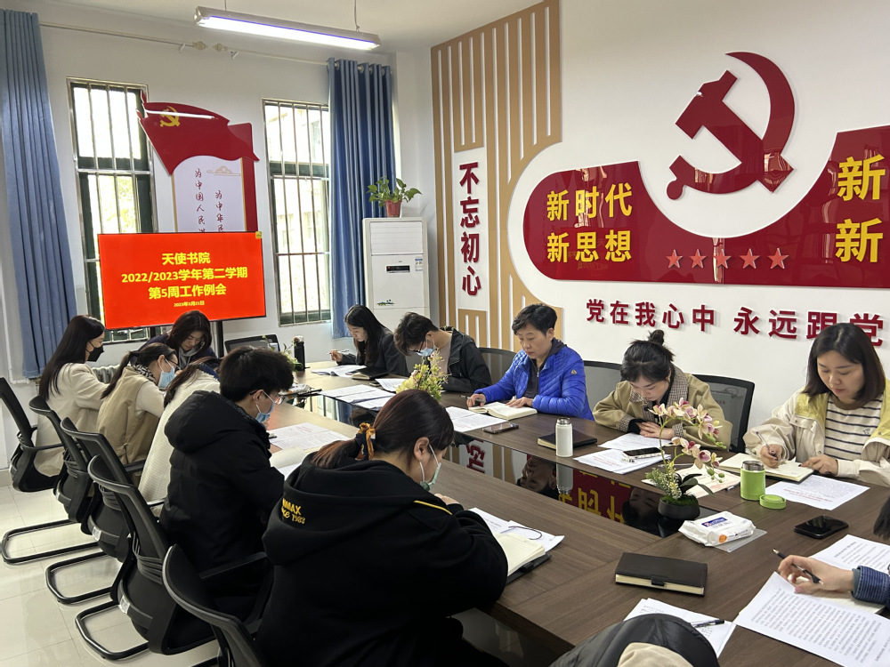 2023年3月21日下午,天使书院在书院二楼会议室召开本学期第五周学生工作例会,党总支书记、院长王芳,党总支副书记、副院长王翡翡,副院长王小珂,书院办公室主任马鹏飞,组织员李文煜及全体专职辅导员参加会议。会议由副院长王小珂主持。