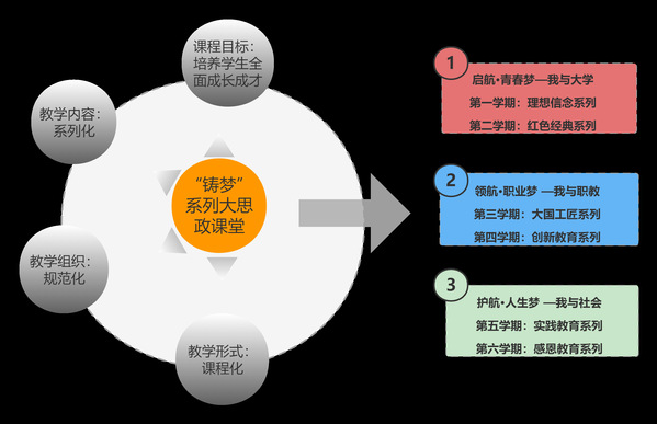 “铸梦”系列大思政课堂是天使书院创新思政育人模式、打造思政育人品牌的有力举措,内容涵盖“启航·青春梦”“领航·职业梦”“护航·人生梦”三个篇章,着重围绕“我与大学”“我与职教”“我与未来”等模块,锚定学生在校期间不同阶段的成长特点和发展需求,分类别、逐学期设计和举行理想信念、红色经典、大国工匠、创新教育、实践教育和感恩教育等系列价值引领主题班会,提升书院思政育人亲和力、感染力、说服力,助力学生成长成才和全面发展。