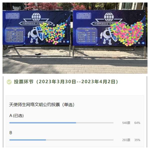 为增强学生网络安全意识,培养学生文明上网习惯,倡导网络文明新风尚,强化书院网络思政育人成效,近日,天使书院开展“遵纪守德 净网有我”网络文明公约投票活动,并以此拉开了“天使书院安全教育主题月”系列活动的帷幕。