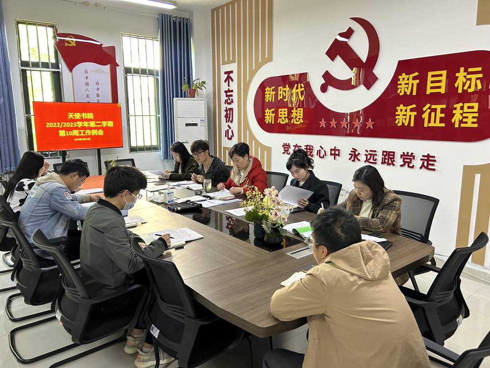 2023年4月25日上午,天使书院在书院二楼会议室召开本学期第十周学生工作例会,党总支书记、院长王芳,党总支副书记、副院长王翡翡,副院长王小珂,书院办公室主任马鹏飞,组织员李文煜及全体专职辅导员参加会议。会议由副院长王小珂主持。