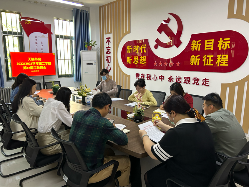 2023年5月9日上午,天使书院在书院二楼会议室召开本学期第十二周学生工作例会,党总支书记、院长王芳,党总支副书记、副院长王翡翡,副院长王小珂,书院办公室主任马鹏飞,组织员李文煜及全体专职辅导员参加会议。会议由副院长王小珂主持。