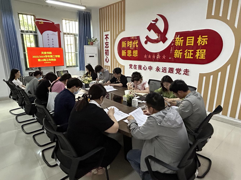 2023年5月16日上午,天使书院在书院二楼会议室召开本学期第十三周学生工作例会,党总支书记、院长王芳,党总支副书记、副院长王翡翡,副院长王小珂,书院办公室主任马鹏飞,组织员李文煜及全体专职辅导员参加会议。会议由副院长王小珂主持。