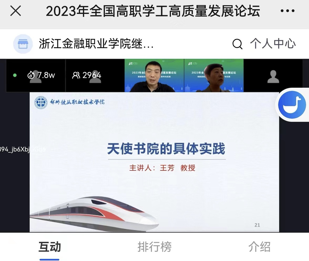 5月20日,书院党总支书记、院长王芳参加由天下学工群委会主办的2023年全国高职学工高质量发展论坛,并作《书院制改革背景下,辅导员队伍建设的具体实践和探索——以郑州铁院天使书院为例》的主题发言,着重围绕“深化改革,创新措施,切实提升书院内涵发展”“强化能力,赋能成长,不断夯实书院队伍建设”“以‘学’铸魂,以‘学’促干,扎实做好书院思政工作”“党建引领,凝聚特色,实践彰显书院育人成效”等四个方面分享了书院育人的理论经验和实践探索,并与参会人员进行了互动交流。