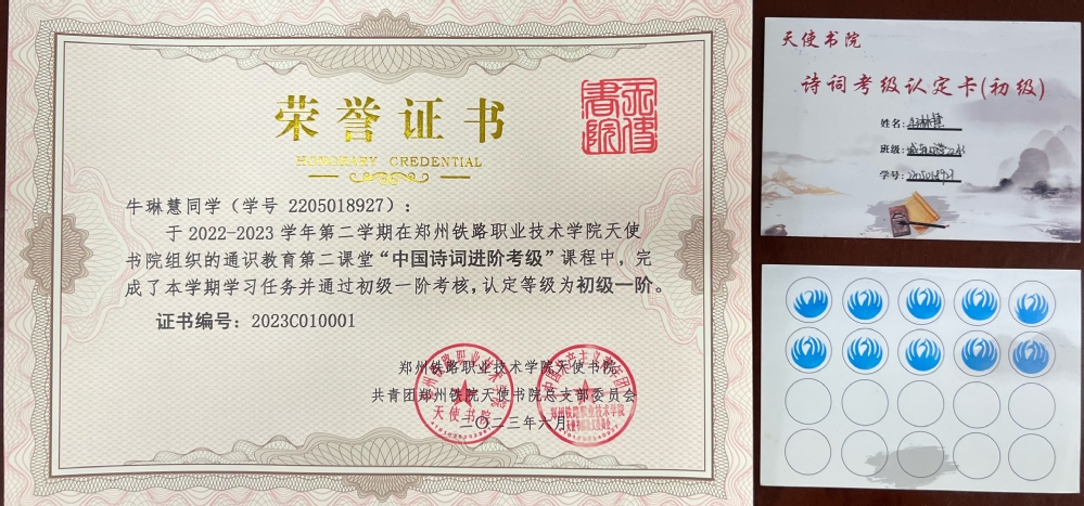 本学期,天使书院立足学生专业培养目标和成长成才需求,从中华优秀传统文化中深挖育人元素,发挥时代价值,以中国古典诗词和毛泽东诗词为切入点,积极组建由书院全体教师参与的通识教育育人队伍,多次组织专题会议开展教学教法研讨,指导“书院建设发展研究中心”自主编制通识教育校本教材《中国诗词考级手册》一套六辑,设置初、中、高三个等级、六个阶段,并通过每周定时更新推送诗词内容、组织考核认定以及开展传统文化类系列学生活动,引导学生积极参与课程学习和第二课堂活动,共计34名学生完成本学期课程学习与考核,获得由书院自主编码的“中国诗词进阶考级·初级一阶”认定证书。