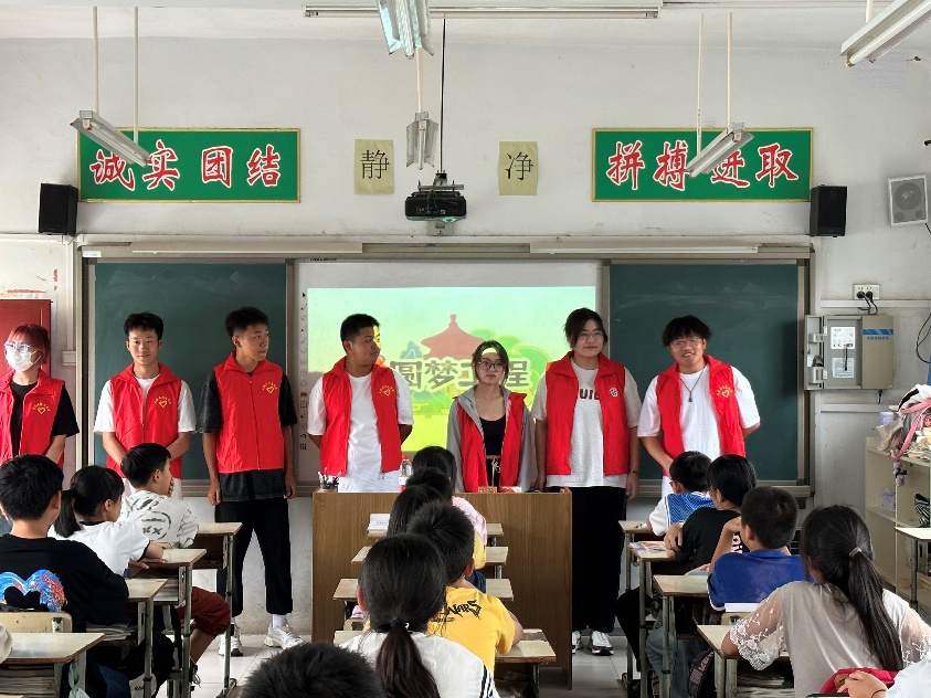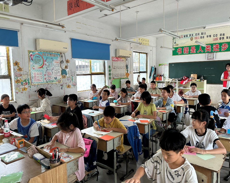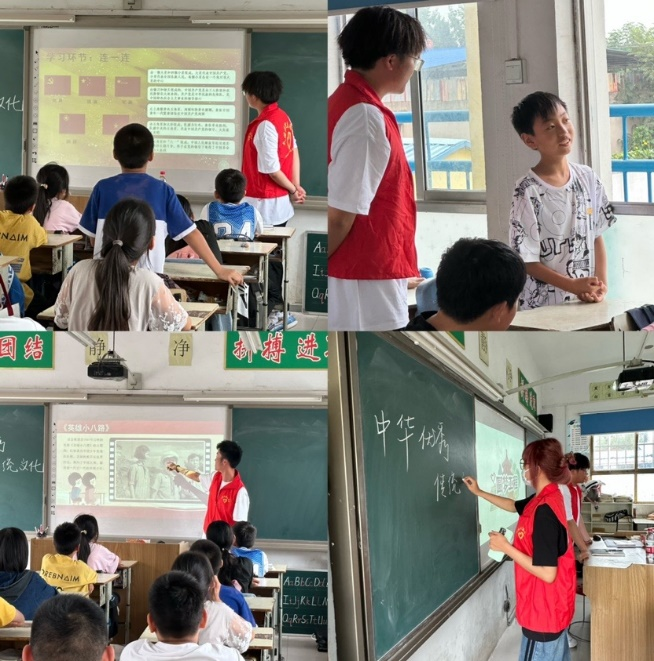 用责任与爱心,打造丰富多彩文化课堂。团队成员多次前往郑州航空港区楼刘小学开展暑期社会实践活动。队员们通过有趣的课外知识和带来的具备中华优秀传统文化元素的文创周边与小同学们拉近距离成为“好朋友”。在课堂宣讲方面,队员们主要在采用PPT、视频等方式宣讲的给同学们传授了中华优秀传统文化概念和作用。同时,在课程中加入了书法、折纸和朗诵等方式的小游戏,为课堂增添了乐趣,深受小同学们的喜爱。