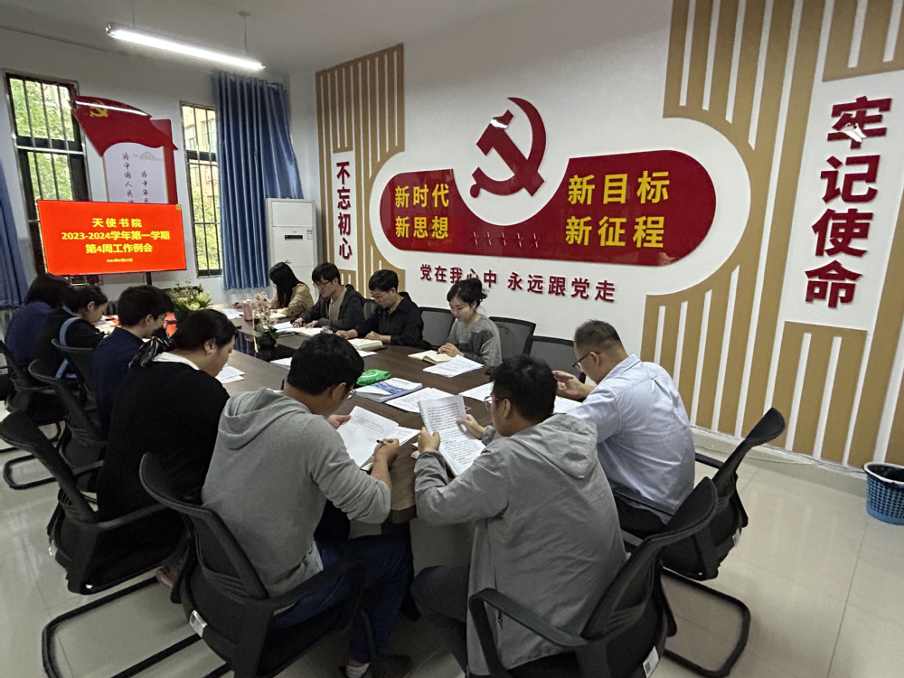 2023年9月25日下午,天使书院在书院二楼会议室召开本学期第四周学生工作例会,书院班子成员及全体专职辅导员参加会议。会议由副院长王小珂主持。