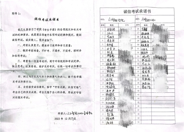 强调诚信考试,营造优良学风,开展考风考纪教育活动。组织书院各班级召开考风考纪专题教育班会、诚信考试主题教育班会等,引导学生重点学习学校《纪律处分规定》《考试违纪、作弊认定与处理细则》等文件精神,全员签订《考试诚信承诺书》,切实增强学生诚信考试的自觉性和主动性。
