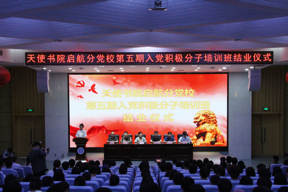 4月28日下午,天使书院启航分党校第五期入党积极分子培训班结业仪式在学校第二报告厅举行。书院领导班子成员及全体育人导师出席会议,494名入党积极分子通过“主会场+视频分会场”相结合的方式参加会议。会议由副院长王小珂主持。