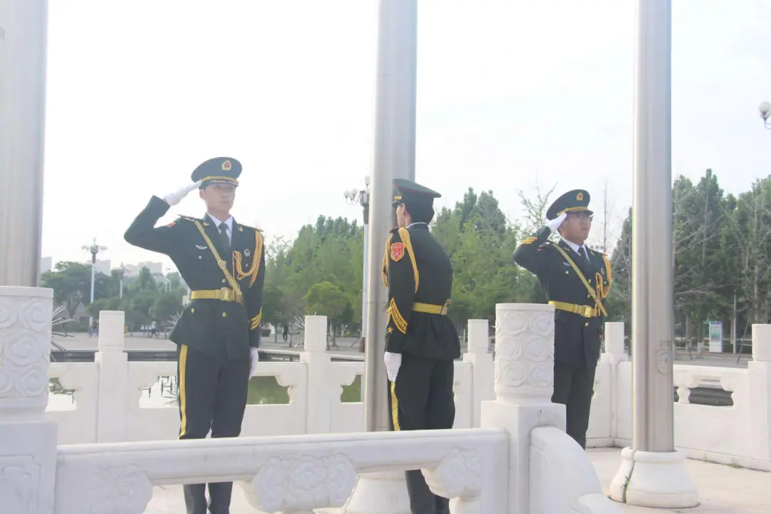 在全体师生的注目礼下,英姿飒爽的国旗护卫队队员们护送鲜艳的五星红旗进场,行礼完毕,伴随着庄严的《中华人民共和国国歌》,五星红旗冉冉升起,迎风飘扬,在场的每一位同学向国旗行注目礼,深怀着对祖国无限的热爱和崇高的敬意。