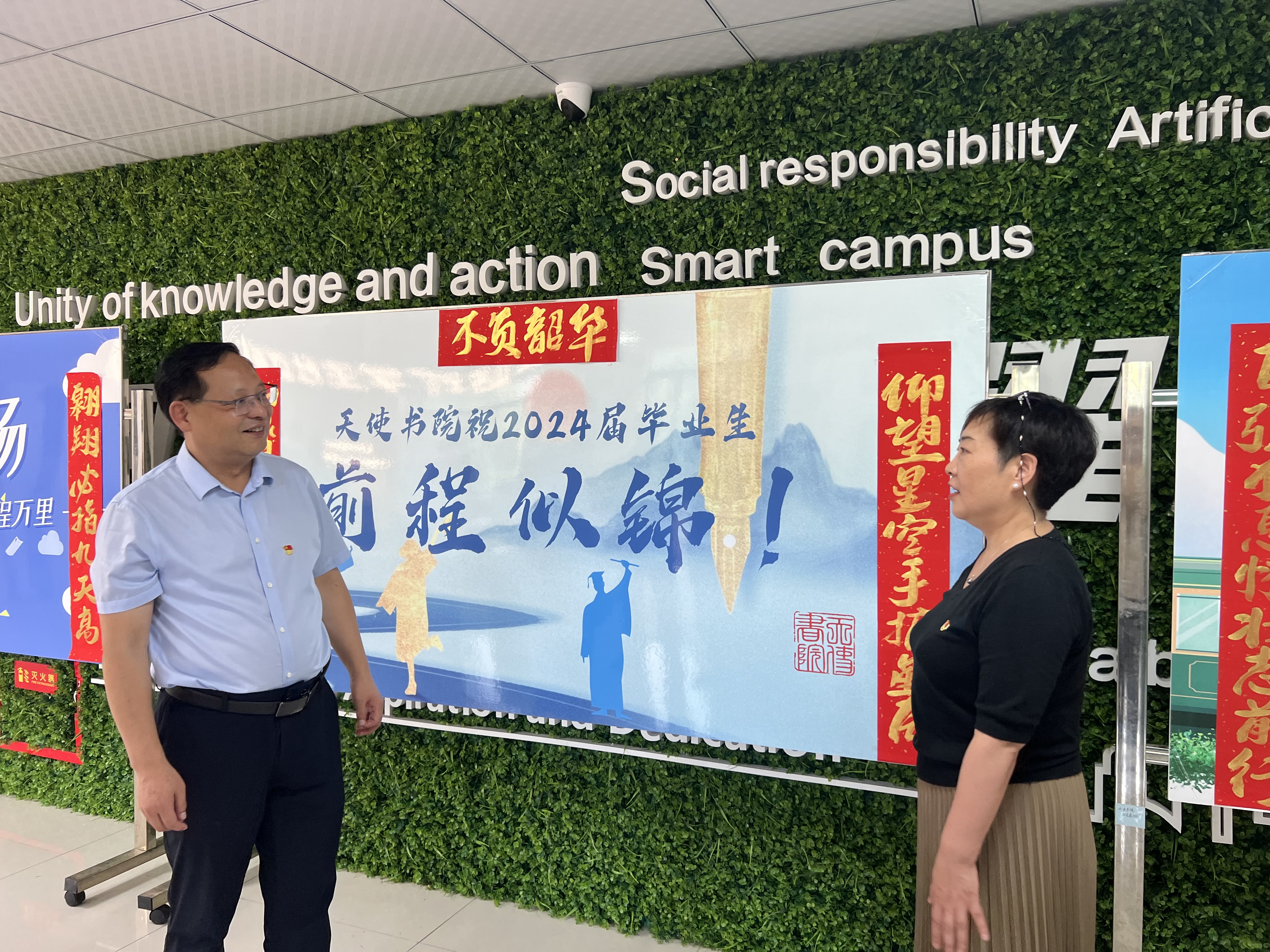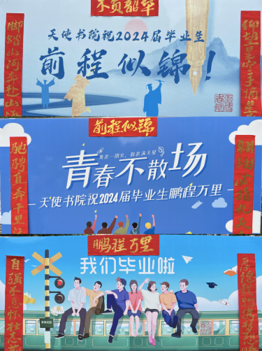 营造浓厚氛围——“风好正扬帆·奋斗向未来”。以“安全、文明、温馨、有序”为目标,坚持以学生为本、用爱心服务,书院成立毕业生离校专项工作组,细化责任分工,制定离校方案,系统开展毕业生离校相关工作。邀请副校长李福胜莅临书院指导工作,并张贴毕业季主题对联勉励2024届毕业生。通过线上推送《致天使书院2024届毕业生的一封信》、线下展出毕业季主题展板等方式,温馨祝福毕业生,营造文明离校和祝福毕业生的浓厚氛围。
