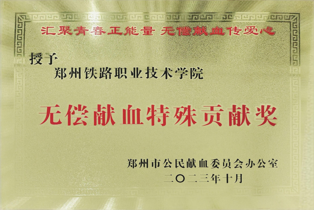 为弘扬无私奉献精神,激发社会关爱生命、热心公益的氛围,2023年10月14日,河南省红十字血液中心举行2023年度省会郑州高校无偿献血工作座谈会暨表彰大会,我校荣获“无偿献血特殊贡献奖”,1名老师和2名学生被评为“先进个人”。