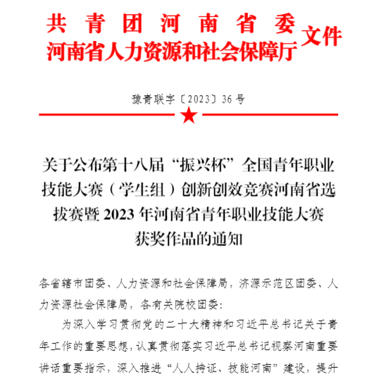 近日,共青团河南省委、河南省省人力资源和社会保障厅公布第十八届“振兴杯”全国青年职业技能大赛(学生组)河南省选拔赛暨2023年河南省青年职业技能大赛——创新创效竞赛获奖名单,我校在本次大赛中荣获省赛金奖2个、银奖3个、铜奖1个,创造了该项赛事的历史最好成绩。