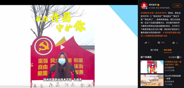 “不要怕!我在许昌守护你!”这是我校天使书院G3-5社区王瑞洁同学在抗疫志愿服务中发出的铿锵誓言,这感人的一幕出现在河南省教育厅官方微博“河南教育”、郑州市委宣传部官方微博“郑州发布”于1月12日相继发布的“河南师生抗疫一线为你守护”的宣传视频《别怕,我在这里守护你!》当中,充分展现出郑州铁院学子抗击疫情的毅然决然和责任担当。