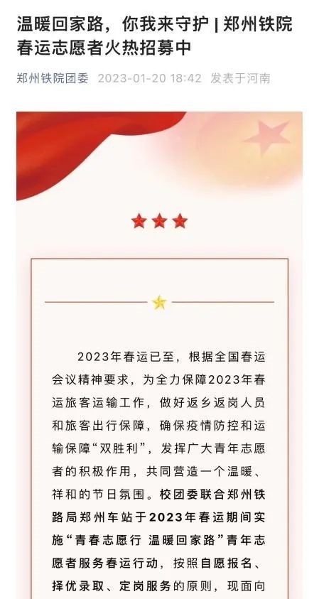 1月18日,习近平总书记通过视频连线看望慰问基层干部群众,在看望慰问郑州东站铁路客运干部职工时,专门嘱咐他们精心组织调度,严守安全底线,确保广大旅客安全出行。青春志愿行,温暖回家路。又是一年春运时,我校学子响应号召,自1月26日起至2月17日止,为期23天的“暖冬行动”春运志愿服务活动圆满结束。此次志愿服务活动不仅弘扬了“奉献、友爱、互助、进步”志愿服务精神,更为保障春运期间旅客的顺利出行作出了积极贡献。
