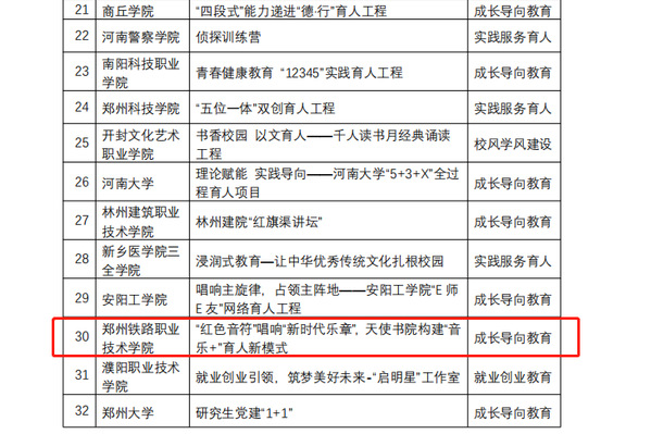 近日,河南省教育厅下发了《关于2022年普通高等学校学生工作优秀成果项目获奖名单的公示》,根据《河南省教育厅办公室关于组织开展2022年普通高等学校学生工作优秀成果项目评选的通知》要求,经高校推荐、省教育厅组织专家评审,通过网络评审、专家评议、现场展示、专家终审等环节,评选出2022年普通高等学校学生工作优秀成果项目一等奖20名、二等奖30名、三等奖40名。我校实践服务育人《“行走的课堂”——中原铁路红色基因青春寻访》项目荣获一等奖,成长导向教育《“红色音符”唱响“新时代华章”,天使书院构建“音乐+”育人新模式》项目荣获三等奖。
