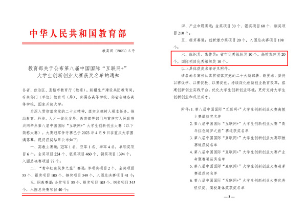近日,教育部发布《公布了第八届中国国际“互联网+”大学生创新创业大赛获奖名单》(教高函【2023】5号),对第八届中国国际“互联网+”大学生创新创业大赛获奖项目和集体组织进行表彰,我校被教育部授予中国国际“互联网+”大学生创新创业大赛“高校集体奖”。