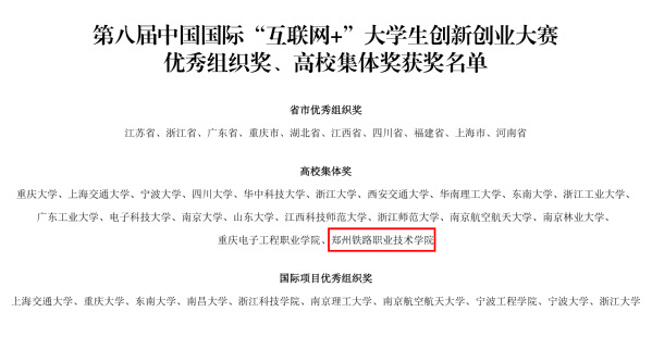 本届大赛中,教育部共评出“高校集体奖 ”20个,其中含知名本科大学18所,高职高专院校仅2所,我校是河南省唯一一所获得此殊荣的高校。我校荣获“高校集体奖”,充分体现了教育部对我校创新创业教育改革和“互联网+”大学生创新创业大赛工作成绩的充分肯定和褒奖,实现了我校在创新创业教育改革工作中的又一历史性突破。