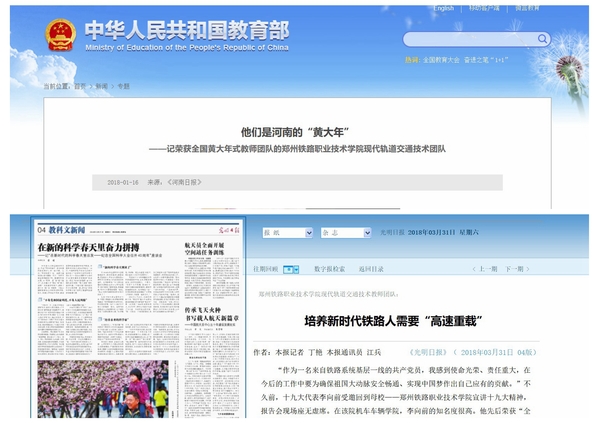 1月16日,教育部网站以“他们是河南的‘黄大年’——记荣获全国黄大年式教师团队的菠菜资源平台大全现代轨道交通技术团队”为题,3月31日,《光明日报》以“培养新时代铁路人需要‘高速重载’”为题,对我校现代轨道交通技术教师团队进行报道。