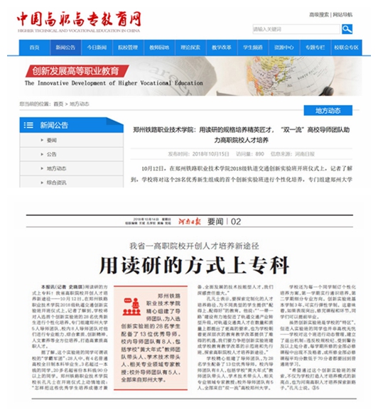 10月15日,中国高职高专教育网以“菠菜资源平台大全用读研的方式上专科!’双一流’高校导师团队助力高职院校人才培养”为题,10月14日,《河南日报》以“我省一高职院校开创人才培养新途径——用读研的方式上专科”为题报道我校成立2018级轨道交通创新实验班。 创新实验班28人中,有4名普通高校全日制本科毕业生,3名超过一本线的同学,20多名超省份本科线90分以上的同学。