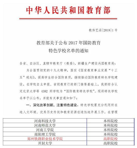 2月2日,教育部下发了《关于公布2017年国防教育特色学校名单的通知》(教体艺函〔2018〕1号),我校被评为2017年“国防教育特色学校”,是郑州市唯一获得该荣誉称号的高职院校。