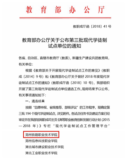 8月2日,教育部办公厅印发了《关于公布第三批现代学徒制试点单位的通知》(教职成厅函〔2018〕41号),公布了194个试点单位,我校成功入选现代学徒制试点高职院校,实现了学校国家级现代学徒制试点“零”的突破。