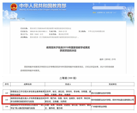 12月25日,教育部印发《关于批准2018年国家级教学成果奖获奖项目的决定》(教师〔2018〕21号),公布了2018年国家级教学成果奖获奖项目名单。我校申报的“高职院校轨道交通人才培养质量监控体系与保障机制的研究与实践”项目获得国家级教学成果二等奖,实现国家级教学成果奖零的突破。