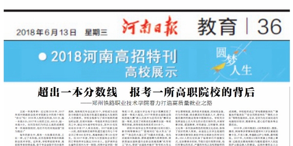 6月13日,《河南日报》以《超出一本分数线 报考一所高职院校的背后》为题报道我校招生情况。近年来,学校单招报考率、高招报考率持续走高,骨干专业录取平均分连年超过本科批次录取控制分数线,生源质量不断提高。铁道类和轨道交通特色专业毕业生连年保持两个接近100%,即100%提前一年被订单培养,100%顺利就业,毕业生就业质量远远高于同类高职院校。