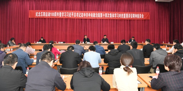 谢乾主持座谈会时指出,全校各级党团组织要组织师生认真学习领会习近平总书记在中共中央政治局第十四次集体学习时的重要讲话精神,认真思考,统一思想,坚定信念,立足本职,创新创效,以习近平新时代中国特色社会主义思想为指引,继承和发扬五四精神,做实现中华民族伟大复兴的生力军,在推动学校事业发展、服务地方经济社会、实现中华民族伟大复兴中国梦的新征程中贡献青春力量,实现青春梦想,向祖国70华诞献礼!