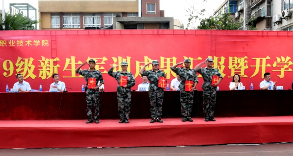 校长孔凡士发表讲话。他代表全校师生员工对全体新生表示欢迎,向圆满完成此次军训任务的同学和全体教官表示祝贺,向三名校友的捐赠表示感谢,并对全体新生寄语殷切希望。一是与祖国同心,以奋斗之歌厚植家国情怀。要时刻谨记习近平总书记“要做爱祖国、爱人民、爱共产党、爱社会主义的大学生”的重托,不忘社会责任,葆有家国情怀,砥砺创新创业精神,化爱国之情为报国之行,融爱校之心于刻苦学习,让个人价值在民族复兴伟业中熠熠闪光。二是与时代同向,以奋斗之姿练就精湛技艺。要牢牢把握时代发展的机遇期,通过专业知识学习和实践能力培养,练就过硬的技术技能本领,不负时代,用奋斗之姿让梦想与时代相向而行。三是与母校同行,以奋斗之光照亮美好明天。要敢于尝试新事物、乐于拓展新视野、善于发现新问题,常感相聚之缘、常怀感恩之心、常发奋斗之力,与母校携手同行,向明天求索奋发。四是与梦想同在,以奋斗之笔书写辉煌篇章。要将长远规划和短期目标有效结合,以笃实坚定的行动砥砺前行,立鸿鹄之志,展骐骥之跃,做脚踏实地的奋斗者。