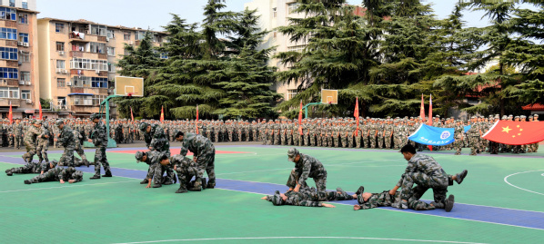 男子擒敌拳方队出拳有力、攻防兼备,静若磐石、动似蛟龙,彰显出血性方刚、斗志昂扬的英勇气魄。