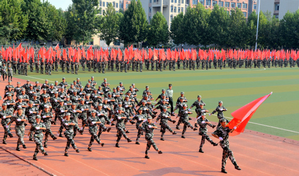 红旗飘扬,如似火年华,如胜利凯歌,红旗方队表演中,一面面“奔跑”的红旗迎风招展,猎猎作响,象征着铁院学子血液里迸发的澎湃热情,为军训会场打亮了鲜艳的底色。