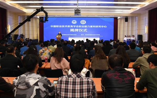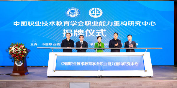 在全场嘉宾的见证下,中国职业技术教育学会会长、教育部原副部长鲁昕,中国职业技术教育学会副会长、河南省人大常委会教育科学文化卫生工作委员会主任、河南省教育厅原厅长朱清孟,河南省教育厅党组成员、副厅长陈垠亭,学校党委书记苏东民、校长孔凡士共同为中国职业技术教育学会职业能力重构研究中心揭牌。