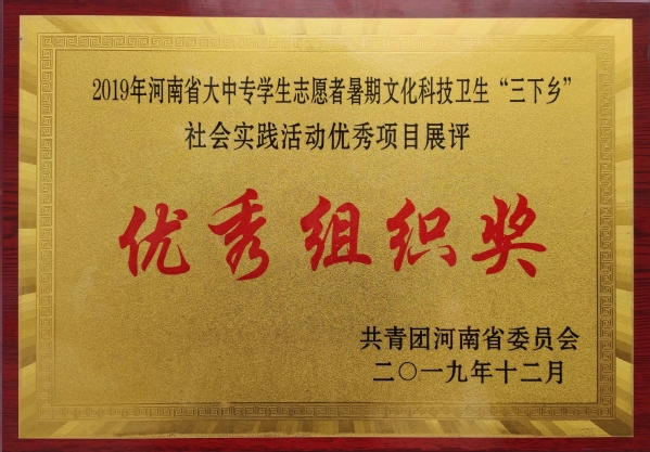 12月19日,2019年全省大中专学生志愿者暑期文化科技卫生“三下乡”社会实践活动优秀项目现场展演活动在新乡学院举行。我校荣获2019年全省大中专学生志愿者暑期“三下乡”社会实践活动优秀组织奖。