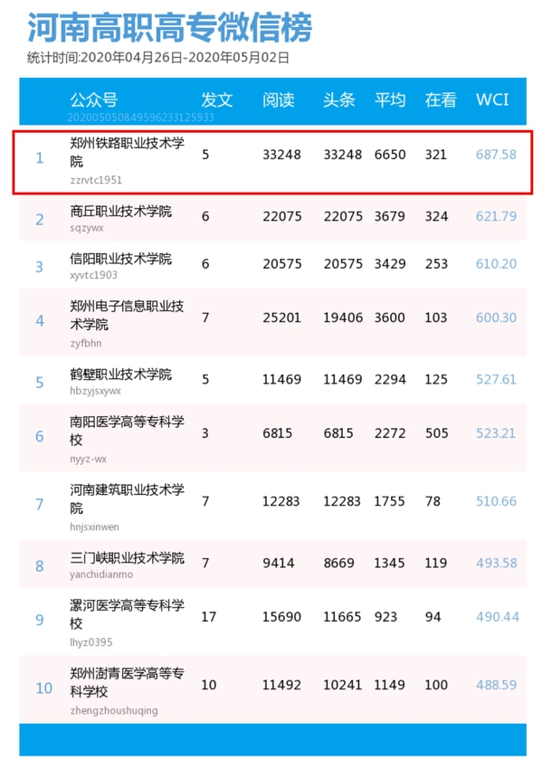 近日,由河南省教育新媒体暨舆情研究中心发布的河南省教育系统两微综合传播力排行榜出炉,我校官方微信推送校党委关于疫情防控工作部署和安排在河南高职高专微信榜TOP10排名中位列第一;在河南高职高专热文榜TOP10排名中,我校《我校举行学生返校复学演练》、《开学序幕即将拉来,他们已做好准备!》《河南省教育厅工作组检查我校开学复课准备工作》三篇推文分别位列第一、第三、第五。