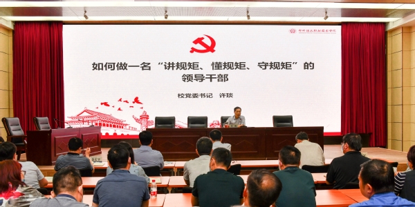 会上,党委书记许琰以《如何做一名“讲规矩、懂规矩、守规矩”的领导干部》为题给全体党员干部上廉政党课。他从“什么是规矩”“为什么要讲规矩”“应该懂什么规矩”“应当如何守规矩”四个方面系统阐释了规矩对一名合格领导干部的重要意义。他指出,党章、党的纪律、国家法律以及党在长期实践中形成的优良传统和工作惯例是党员必须遵守的规矩,讲规矩才能形成用制度管权、靠制度管人、按制度办事的有效机制,全体党员干部要懂得做政治上的明白人、讲原则的守护人、廉洁自律的模范人,不以事小而不为、事杂而乱为、事急而盲为、事难而怕为。他要求,全体党员干部要加强学习、提高认识,强化纪律观念,要勇于实践、敢于担当,增强党性修养,要遵纪守法、“四律”并举,维护公仆形象,要统筹兼顾、讲究方法,正确处理好十个方面关系。他强调,建设一支“讲规矩、懂规矩、守规矩”的干部队伍,是为实现“全国一流”高职院校提供坚强组织保证的重要举措。
