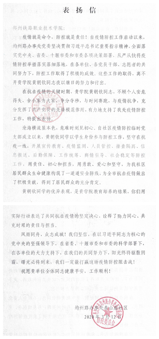 信中写到:“黄朝钦同学不顾个人安危得失,舍小家为大家,与时间赛跑、与疫情抗争,以大学生志愿者身份参与疫情防控工作,坚守在抗疫一线,用责任、初心和担当,用勇敢、爱心和坚守,为社区居民群众生命健康构筑了一道安全防线,为抗击疫情做出了积极贡献,得到了居民群众的充分肯定。”