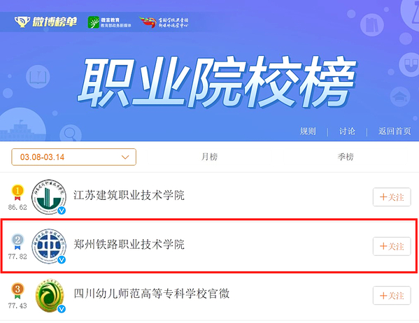 “微博校园榜”定期组织发布全国职业院校官方微博阶段排名,包括周榜、月榜、季榜和年度榜单。排行榜对全国职业院校官方微博的内容质量、传播力和贡献力进行标准化后,加权计算,得出总分,是目前在全国高校官方微博中影响力较大的综合评价体系。