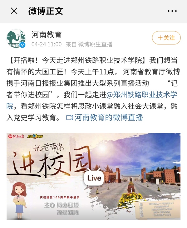 这是河南日报“记者带你进校园”大型直播活动继郑州大学、河南大学、河南农业大学之后的第四站。河南省教育厅官方微博、河南日报客户端、顶端新闻APP同步进行了直播。