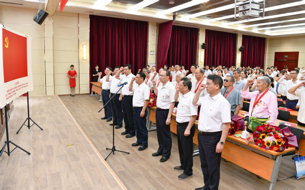面对鲜艳的党旗,在许琰的领誓下,新党员庄严宣誓加入中国共产党,老党员重温入党誓词。