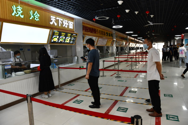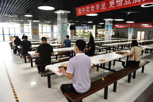参加演练人员间隔1.5米排队,进行手部消毒、体温检测等流程进入饭堂,体温异常等突发事件立即启动相关应急机制。进入饭堂后,就餐人员按照地面标示路线进行排队购餐、取餐,根据地面标示路线离开食堂。堂食按防疫标准设置单人单桌同向就餐位,就餐完毕人员完成垃圾分类投放并由指定出口离开。