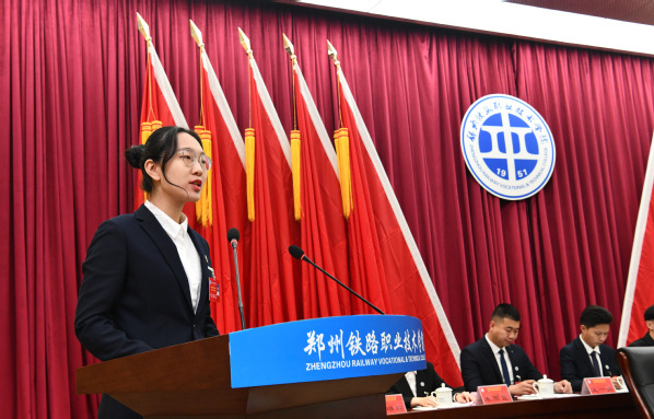 随后,第四届学生会主席团成员李沛尧同学代表第四届学生会向大会作题为《青春逢盛世,奋斗正当时,团结带领全校青年学生为建设中国特色高水平高职学校贡献青春力量》的工作报告。兄弟院校学生会代表,河南交通职业技术学院学生会主席孙军旗同学因疫情防控无法到场,由我校主席团成员管启萌在开幕式上代表致辞。