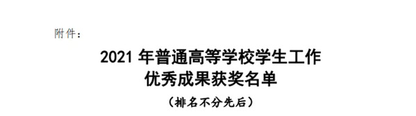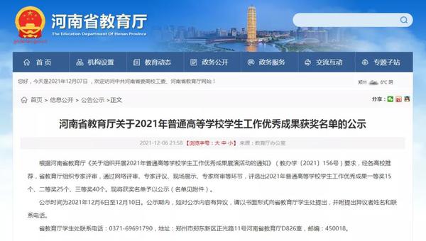 根据河南省教育厅《关于组织开展2021年普通高等学校学生工作优秀成果展演活动的通知》(教办学〔2021〕156号)要求,经各高校推荐,省教育厅组织专家评审、通过网络评审、专家评议、现场展示、专家终审等环节,我校“思想引领,文化浸润,构建学生管理新模式”项目荣获2021年普通高等学校学生工作优秀成果三等奖。