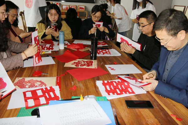 汉韵社剪纸工作坊负责人为大家介绍了中国民间剪纸的文化内涵、艺术特征、民俗功能、当代传承,随后老师们共同手持剪刀和红纸,一起体验传统剪纸的非凡魅力和风采。在制作过程中老师们认真专注,整个活动新颖有趣,现场氛围融洽欢乐。