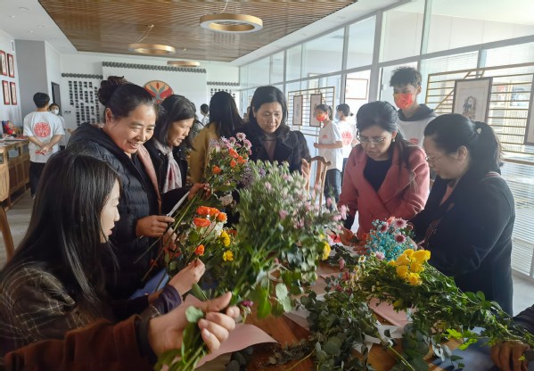 与花相伴,绽放芳华。在插花活动环节,专业老师围绕不同花艺类型、中国传统花艺等知识进行讲解,并示范如何制作花篮。女教职工现场观摩操作,修剪花枝、整理花朵、构思扦插位置,探讨插花要领,体验插花艺术,感受插花艺术带来的精神享受。