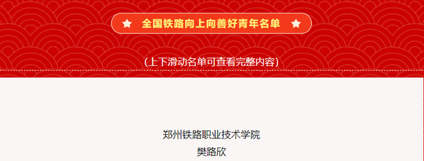 日前,在全国铁道团委组织的2021年度“全国铁路向上向善好青年”评选中,我校动车技术19A2班樊路欣同学、铁道机车19Y3班屈靖超同学分别获得“勤学上进好青年”和“崇德守信好青年”荣誉称号。