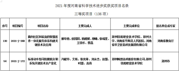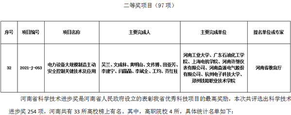 近日,河南省人民政府下发《关于2021年度河南省科学技术奖励的决定》(豫政〔2022〕10号),公布了2021年度河南省科学技术进步奖获奖名单,我校共荣获省科学技术进步奖3项。其中,作为第一主持单位获三等奖一项,参与单位获二等奖、三等奖各一项。