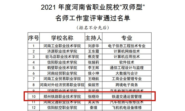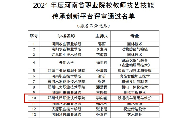 5月24日,河南省教育厅办公室下发《关于公布2021年度河南省职业院校“双师型”名师工作室和教师技艺技能传承创新平台名单的通知》(教办职成〔2022〕170 号),我校张晓玲老师负责的铁道交通运营管理团队获批“双师型”名师工作室,铁道机车运用与维护专业李向前团队获批教师技艺技能传承创新平台,我校传承创新平台实现“零”突破。